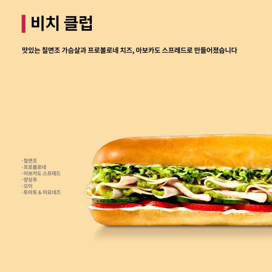 비치클럽은 지미존스를 대표하는 시그니처 샌드위치 중 하나로, 부드러운 터키 브레스트와 크리미한 아보카도 스프레드, 아삭한 오이와 상추, 토마토, 마요네즈가 조화를 이루는 담백한 메뉴입니다.