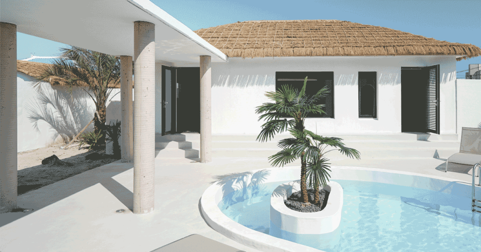초가지붕과 하얀 벽이 인상적인 송당아진은 제주 전통과 남국 분위기를 동시에 느낄 수 있는 감성 숙소입니다. 에메랄드빛 풀장과 이국적인 야자수가 포토존 역할을 톡톡히 하며, 조용한 마을 안에 위치해 완벽한 힐링을 보장합니다. SNS용 사진 찍기에도 최적화된 장소예요.