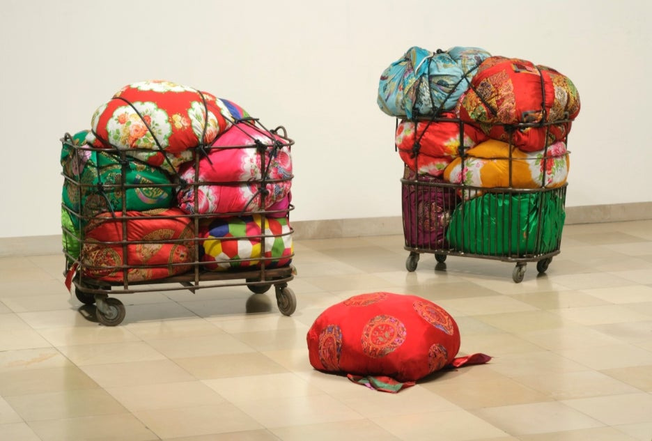 김수자 작가의 작업은 물리적인 창작보다는 존재의 상태, 이동, 침묵, 이방성에 집중합니다. 도시를 배경으로 한 퍼포먼스와, 전통 이불보로 구성된 보따리는 개인과 사회, 중심과 주변, 물질과 비물질 사이의 경계를 무너뜨립니다.