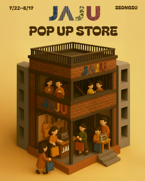 2025년 여름, 라이프스타일 브랜드 **JAJU(자주)**가 성수동에 팝업스토어를 열었습니다. “일상의 감각”을 테마로 일상 속에서 자연스럽게 스며드는 자주의 제품과 문화를 체험할 수 있는 공간으로, 브랜드의 감성과 고객 경험을 모두 담아냈습니다.