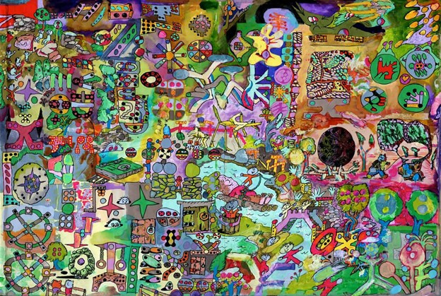 텍스트, 캐릭터, 패턴, 선과 색채가 서로 뒤엉켜 정제되지 않은 감정의 집합처럼 느껴집니다.