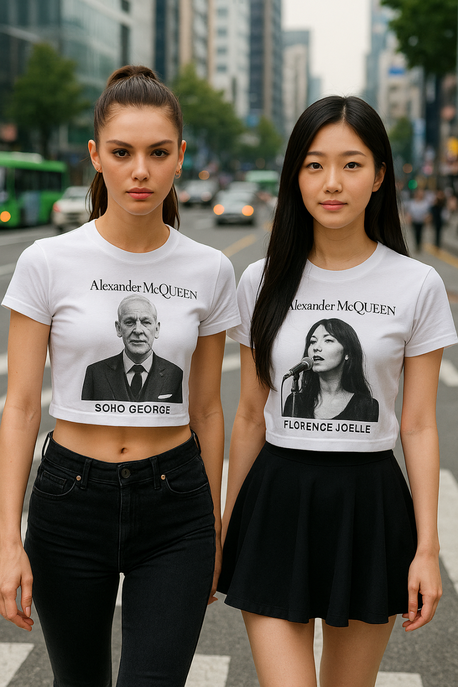 맥퀸의 아이덴티티를 담은 이 티셔츠는 핏한 크롭탑 스타일로도 연출 가능합니다. 실제로 강남대로에서 촬영된 스트리트 스타일 화보에서는, 티셔츠를 하이웨이스트 블랙 진이나 플레어 스커트와 매치해 시크하면서도 감각적인 스타일을 완성한 모습을 볼 수 있습니다.